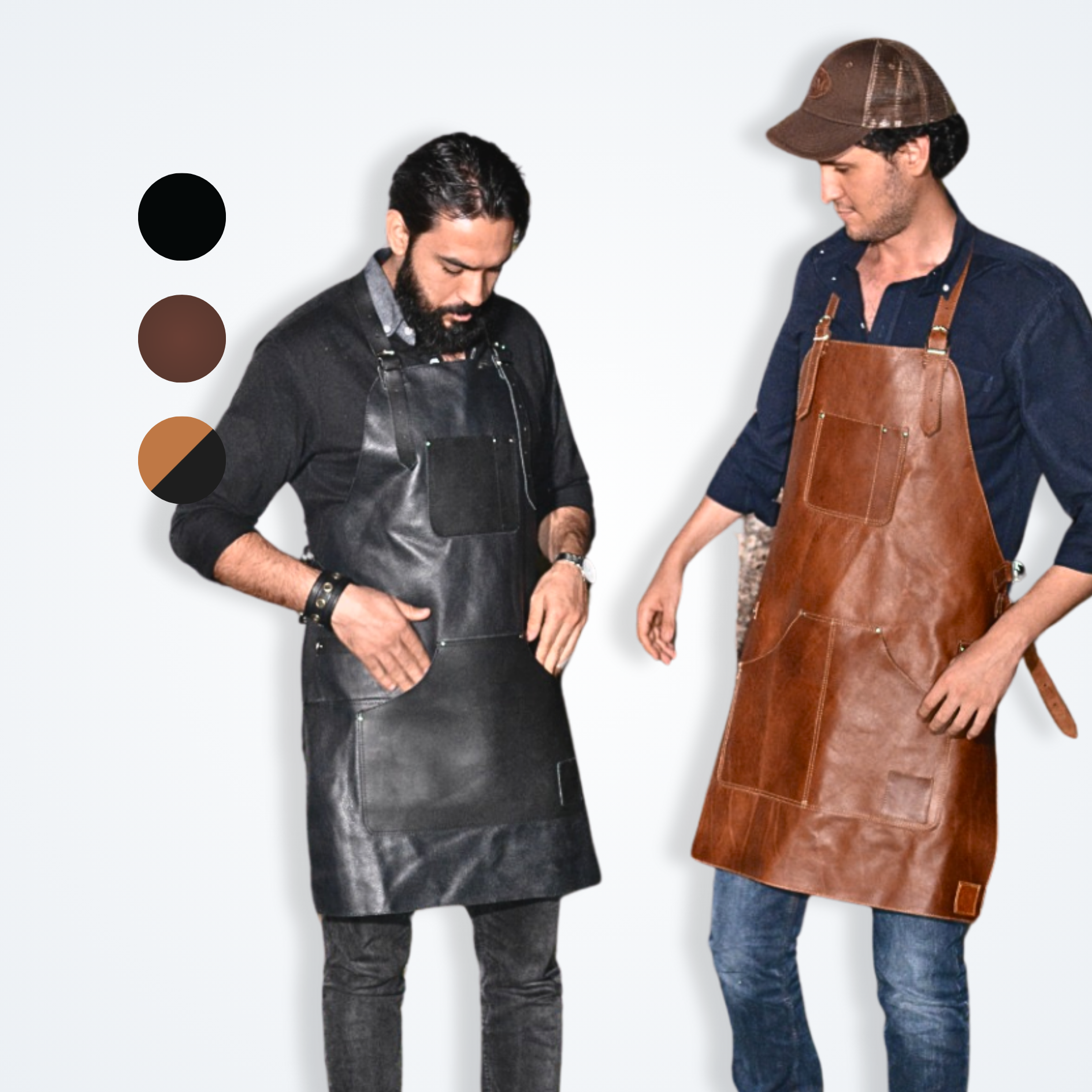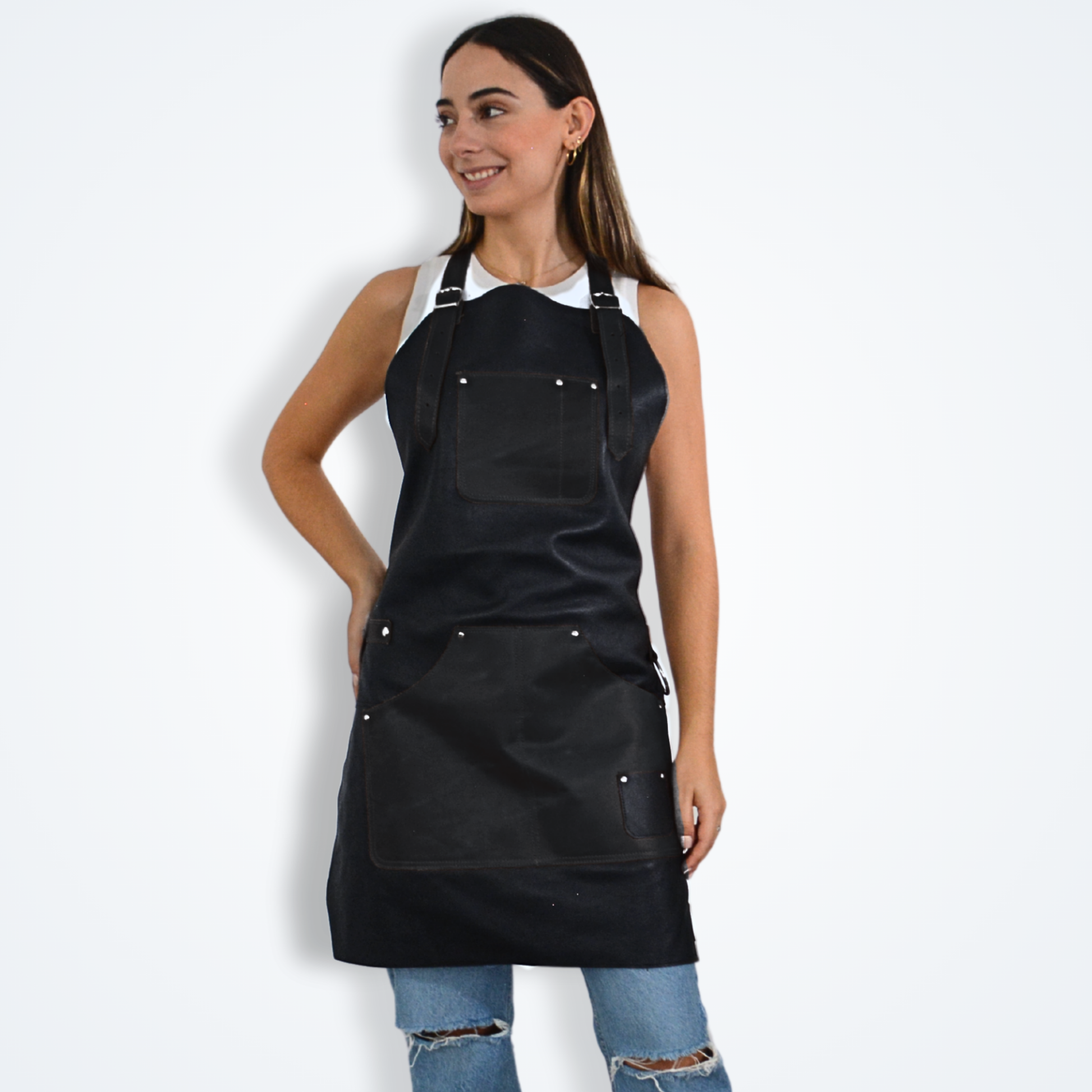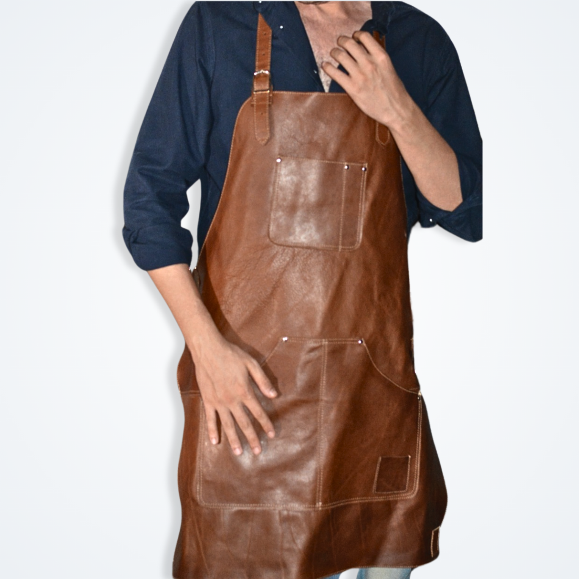 Mandil Unisex. Fabricado completamente de piel genuina 100%. máxima protección te protege del fuego y agua. Cuenta con 2 bolsas grandes, 1 compartimento para colgar tus herramientas, un destapador, una argolla y cintas de la espalda ajustables y cruzadas para mayor comodidad y distribución del peso.