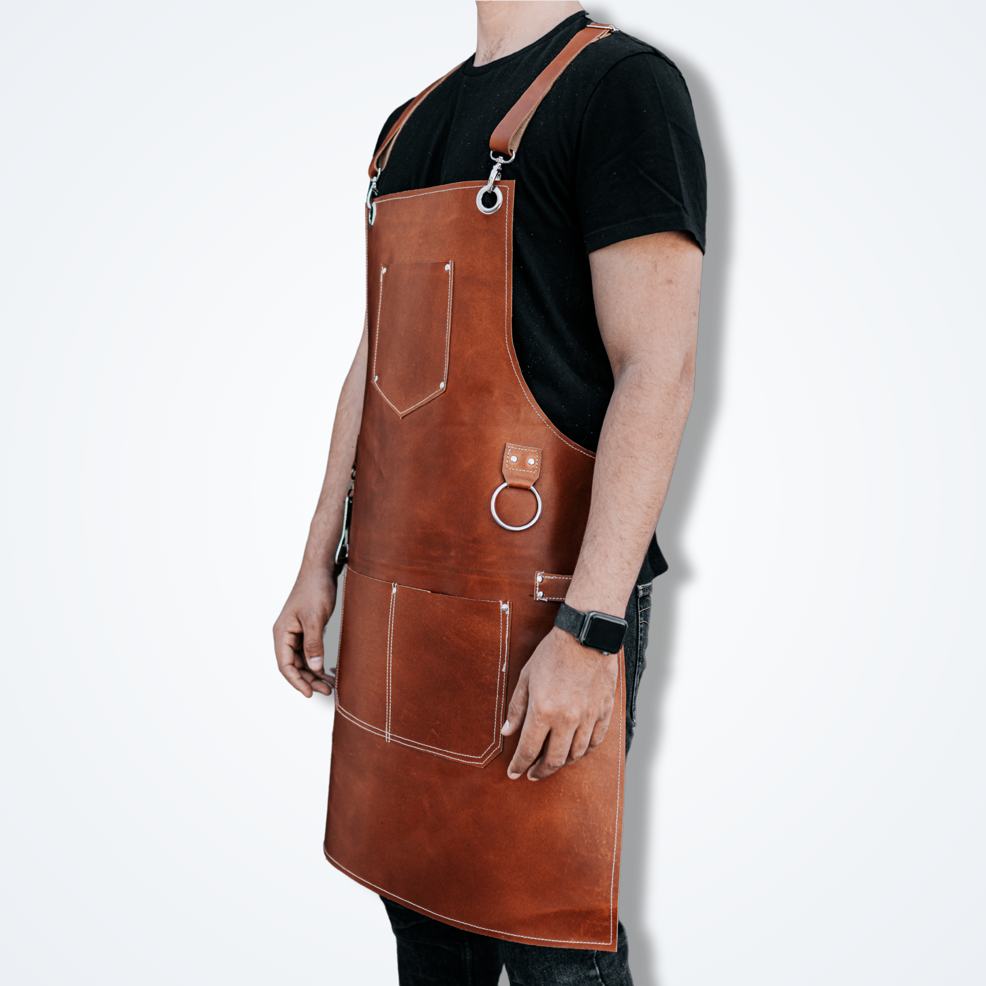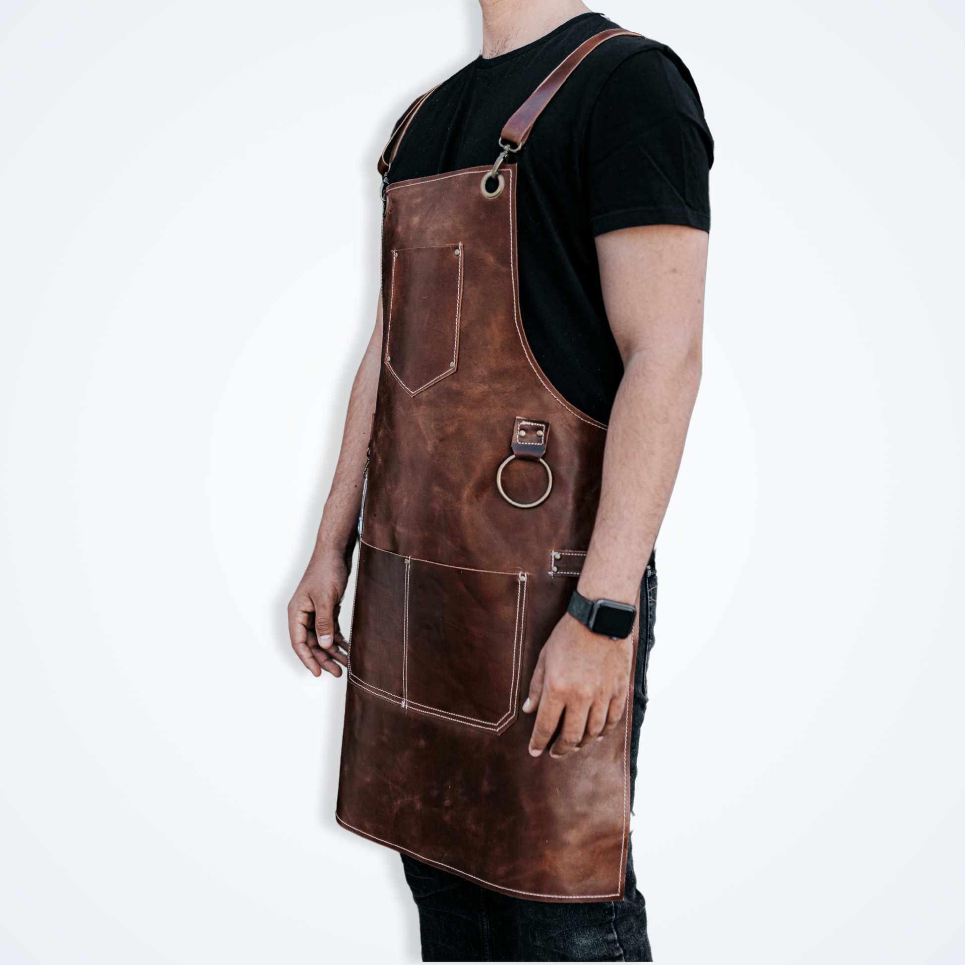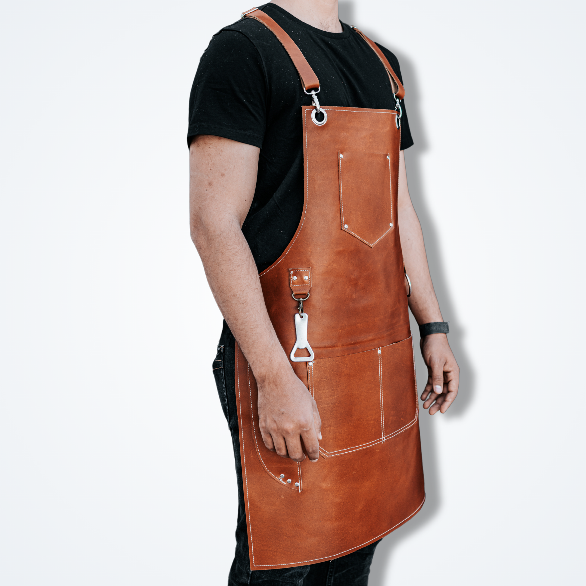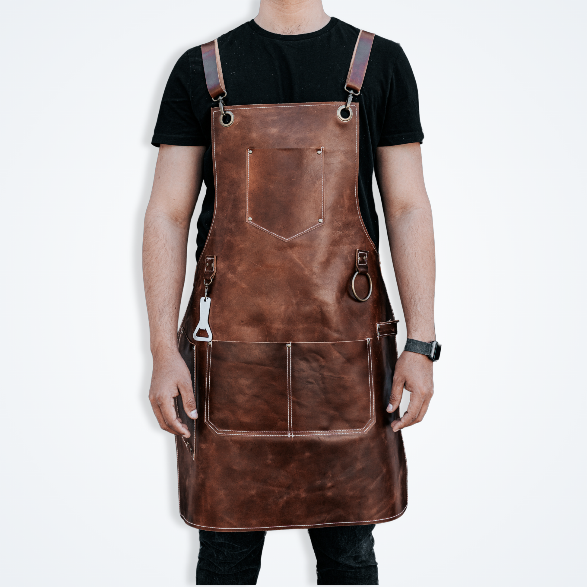 Mandil Unisex. Fabricado completamente de piel genuina 100%. maxima proteccion te protege del fuego y agua. Cuenta con 3 bolsas grandes, 2 compartimentos para colgar tus herramientas, un porta cuchillo, un destapador, una argolla y cintas de la espalda ajustables y cruzadas para mayor comodidad y distribucion del peso.