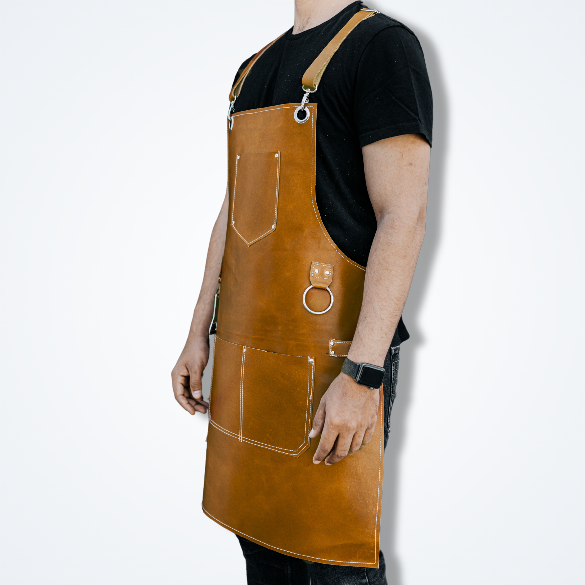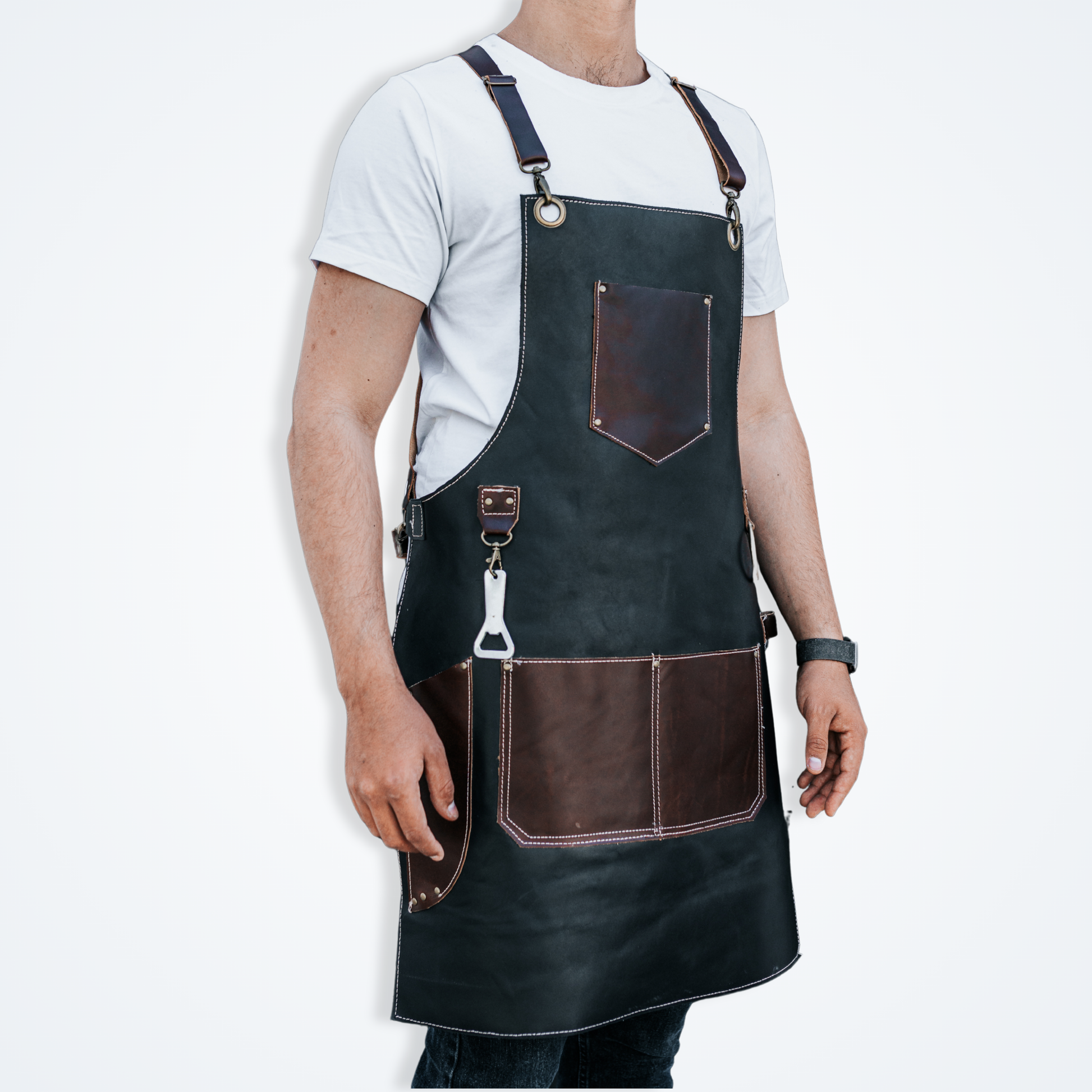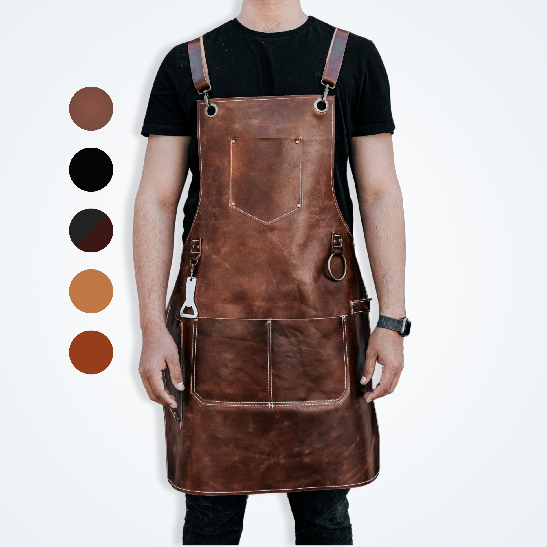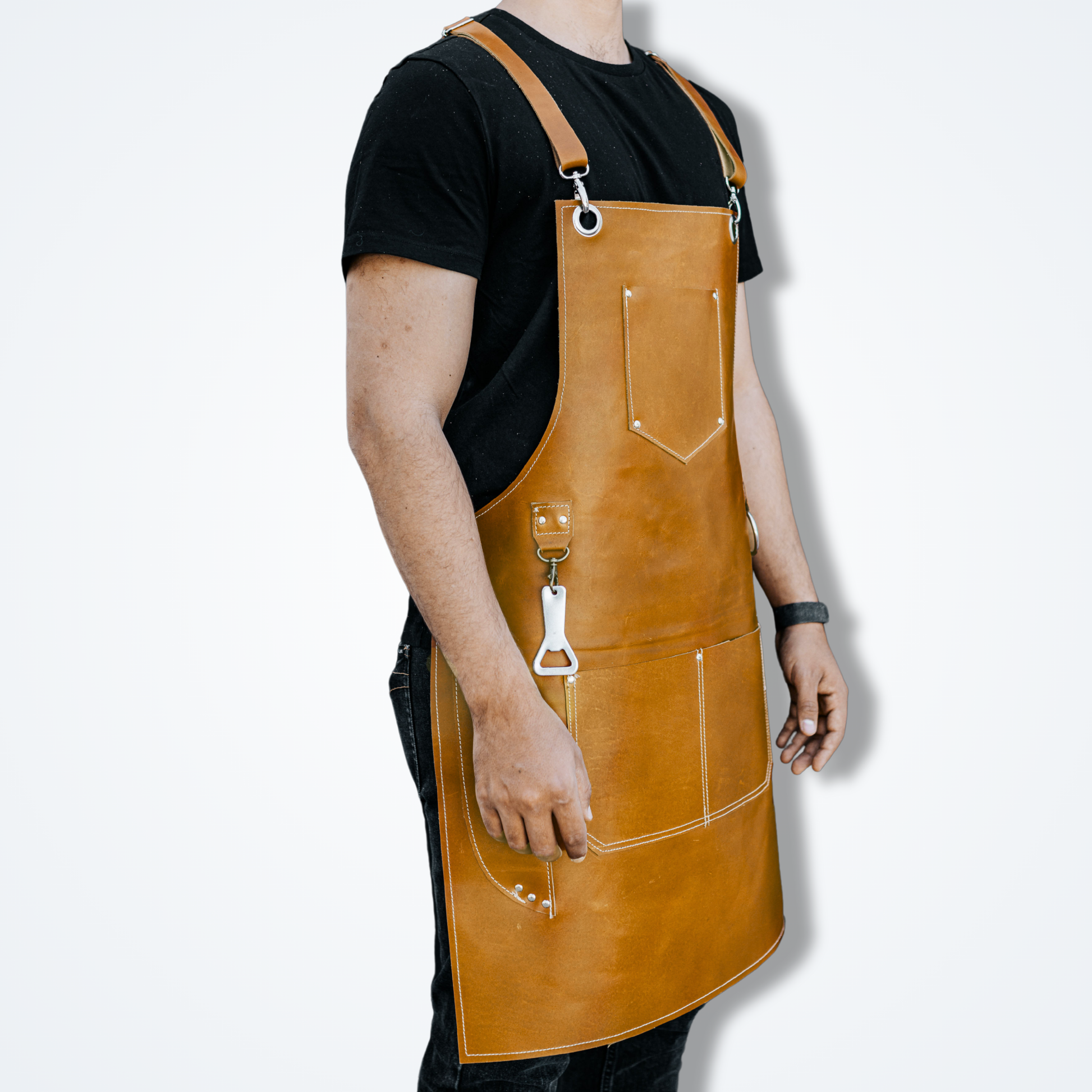 Mandil Unisex. Fabricado completamente de piel genuina 100%. maxima proteccion te protege del fuego y agua. Cuenta con 3 bolsas grandes, 2 compartimentos para colgar tus herramientas, un porta cuchillo, un destapador, una argolla y cintas de la espalda ajustables y cruzadas para mayor comodidad y distribucion del peso.