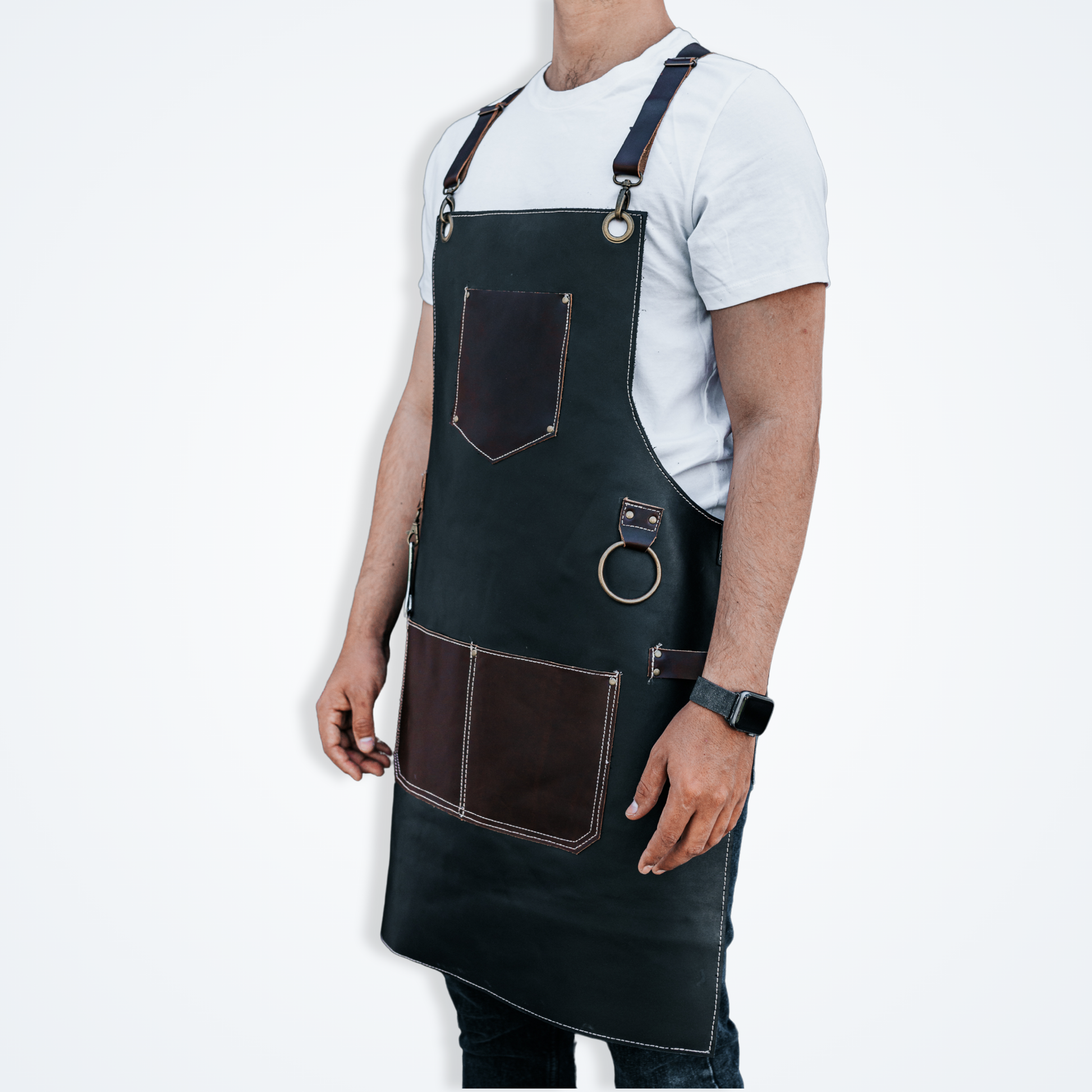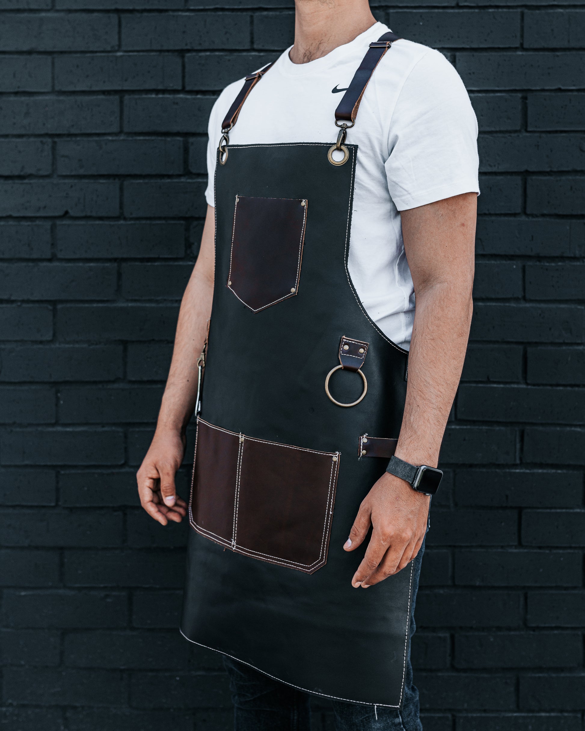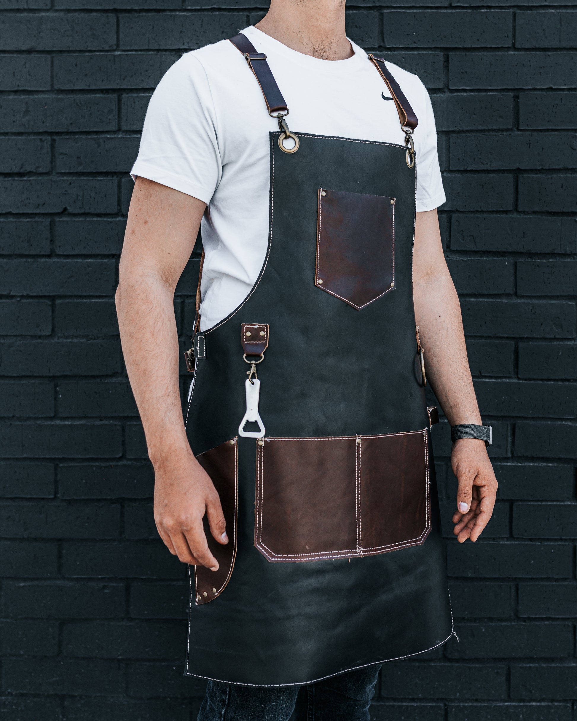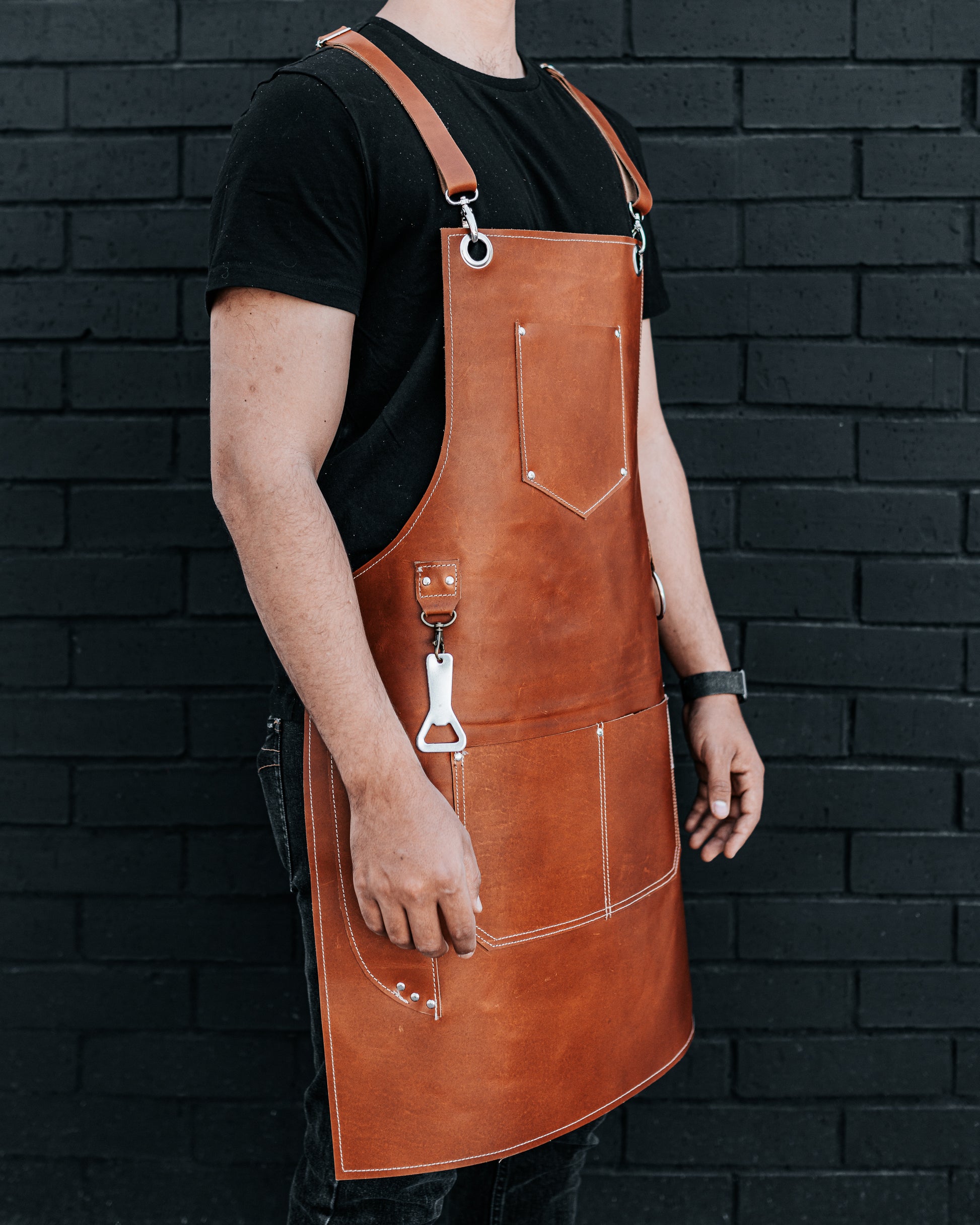 Mandil Unisex. Fabricado completamente de piel genuina 100%. maxima proteccion te protege del fuego y agua. Cuenta con 3 bolsas grandes, 2 compartimentos para colgar tus herramientas, un porta cuchillo, un destapador, una argolla y cintas de la espalda ajustables y cruzadas para mayor comodidad y distribucion del peso.