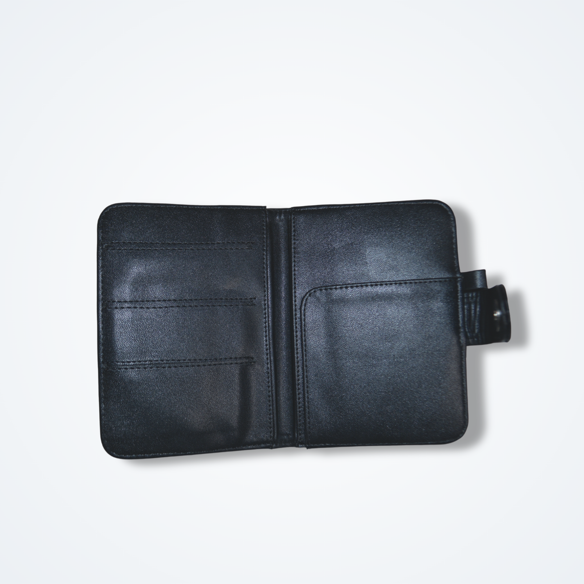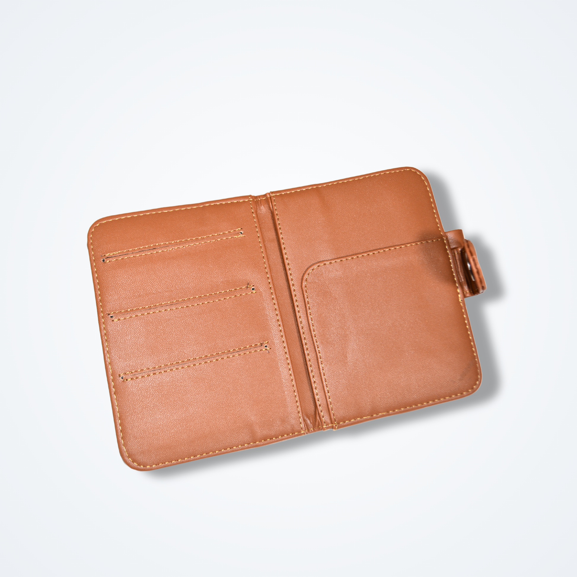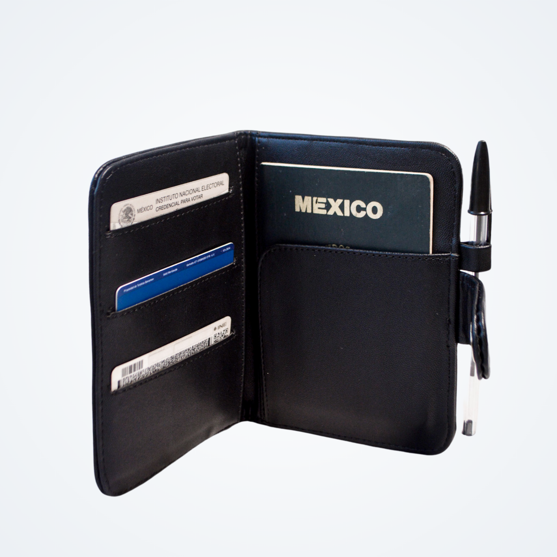 • con espacio para uno o hasta dos pasaportes, 3 ranuras para tarjetas y credenciales, así como un práctico soporte para una pluma.